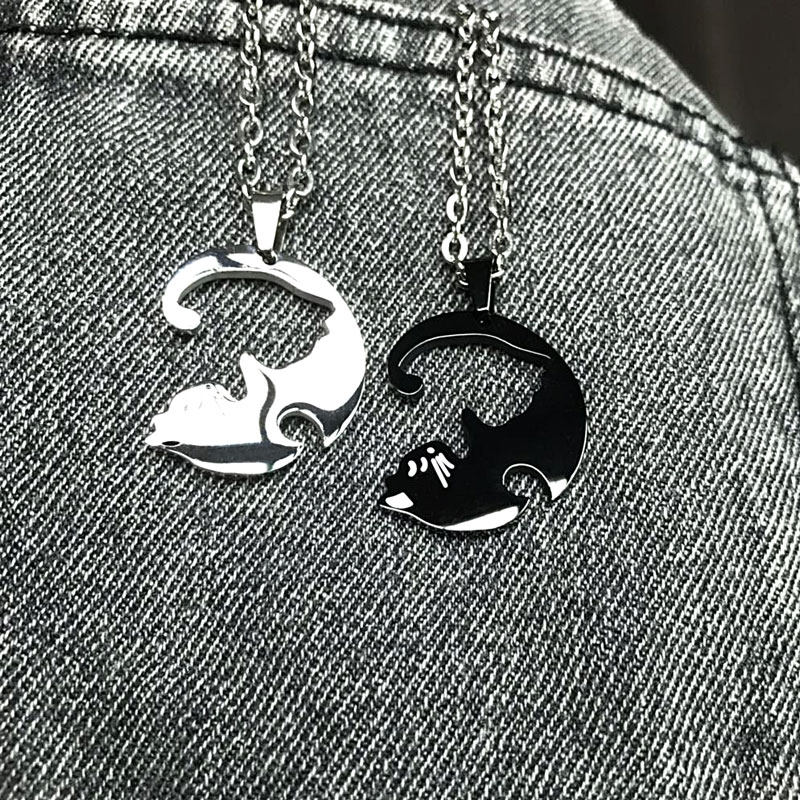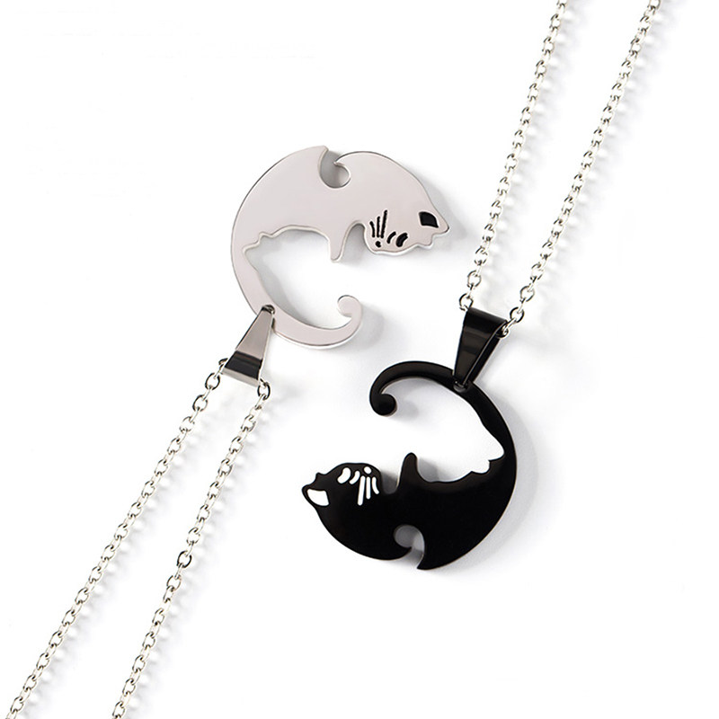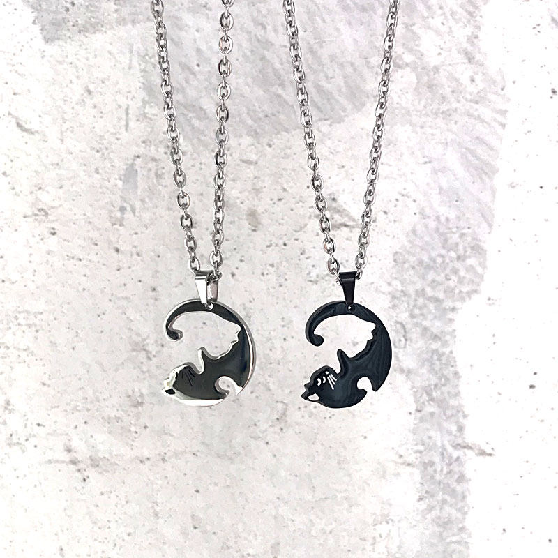 愛らしい猫のシルエットが寄り添うデザインのペア アクセサリーです。 2つのトップを合わせると1つの円を描く仕様で、お互いの存在を確かめ合うような特別な意味が込められています。 繊細なチェーンと立体的な猫のフォルムが上品な印象を演出するネックレスです。 大切な人との絆を表現する、カップルや友人同士におすすめのアイテムです。