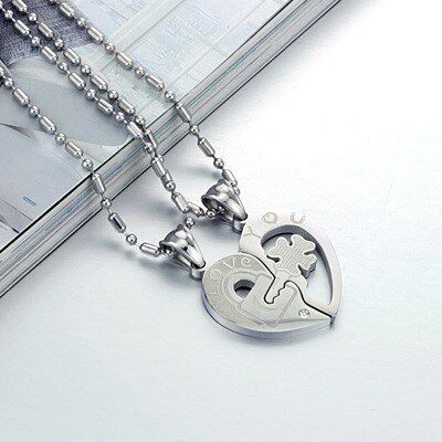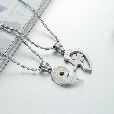 二つに分かれるハートモチーフが愛の絆を象徴するペア アクセサリーです。 片方には鍵、もう片方には錠前のデザインが施され、二人が揃うことで一つの完全なハートを形作ります。 ネックレスのトップには愛を表す文字が刻まれ、小さな輝石が上品なアクセントを添えています。 長さ調節可能な玉鎖チェーンで、日常使いにも特別な日にも最適です。 大切な人との永遠の愛を胸元で感じられる特別なペアネックレスです。