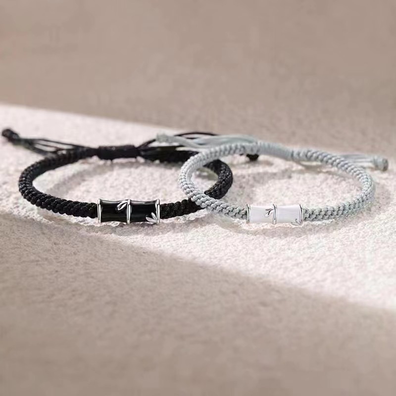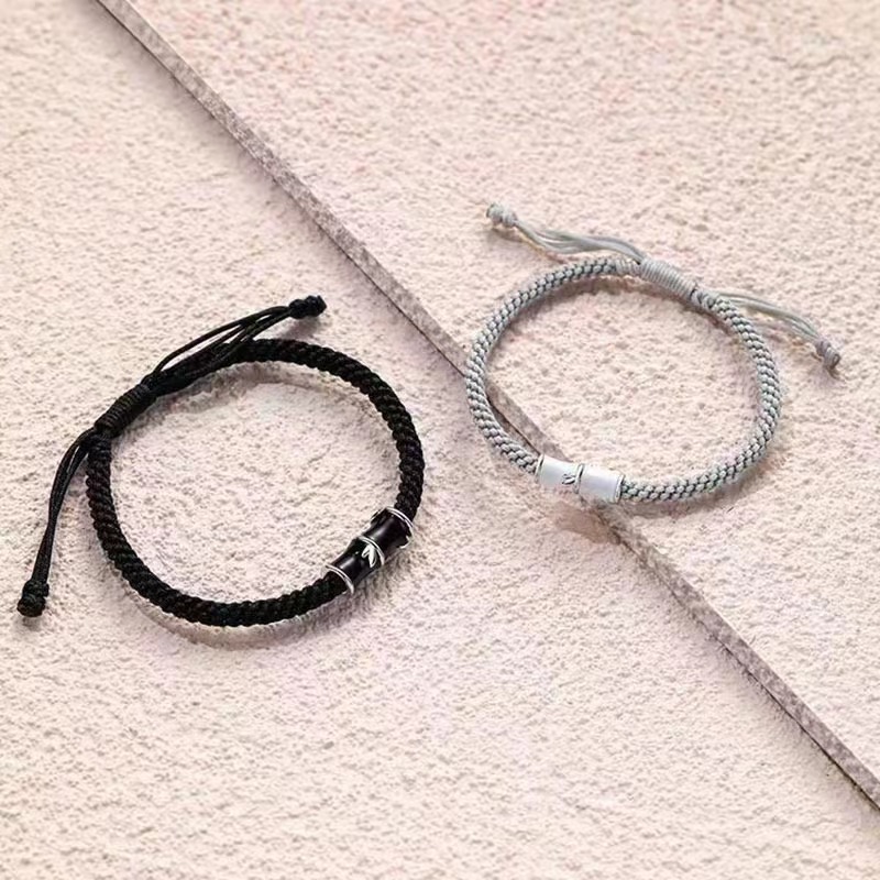 洗練されたデザインのバングルです。 編み込まれた紐にステンレス製の金属板を組み合わせた上品な仕上がりで、正装から日常使いまで幅広くお使いいただけます。 長さ調節が可能なので手首のサイズを気にせず快適に着用できます。 ペア アクセサリーとして大切な人とのお揃いや記念日の贈り物に最適です。