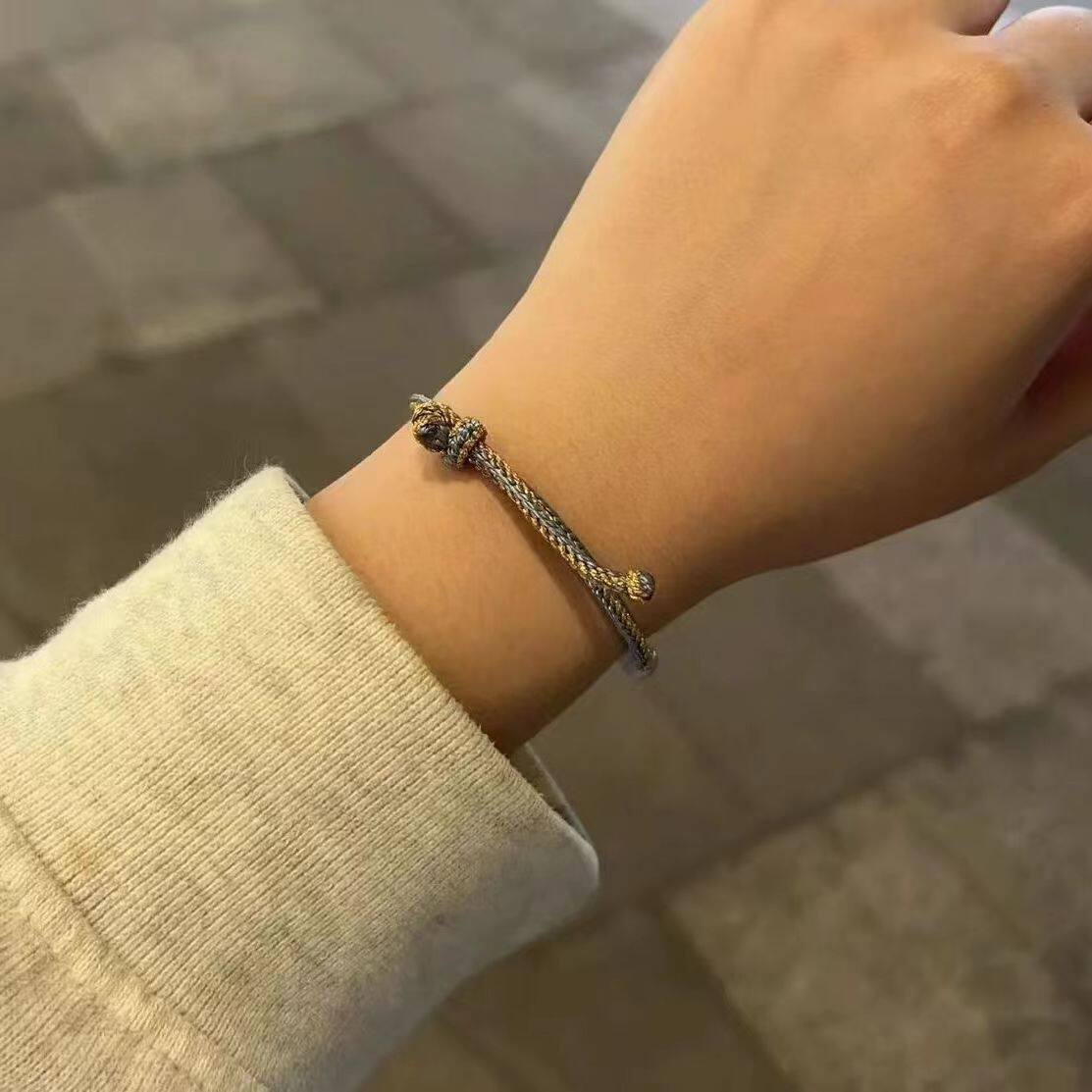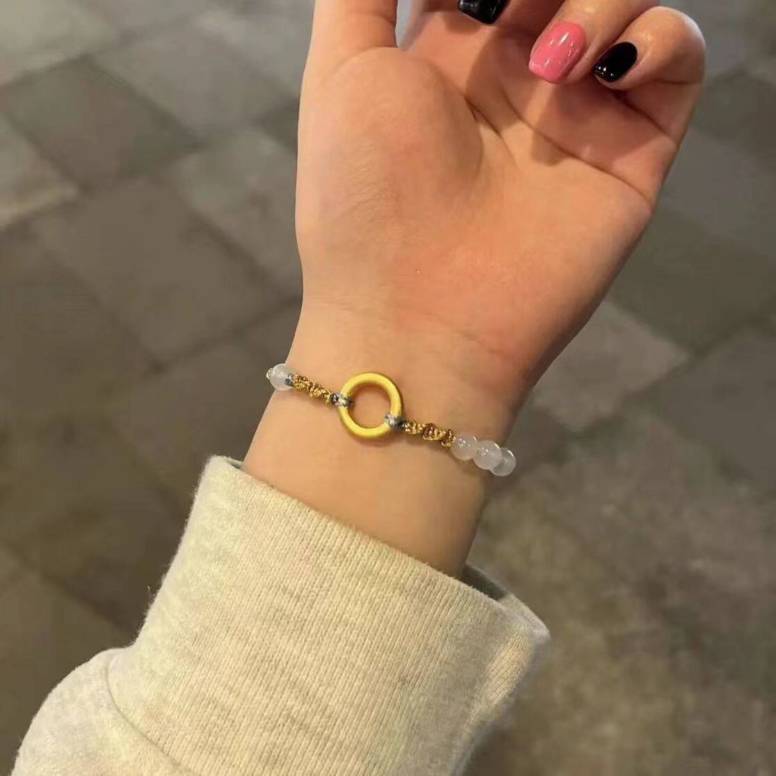 華奢な紐に通されたビーズと中央の円形チャームが手元を上品に彩ります。