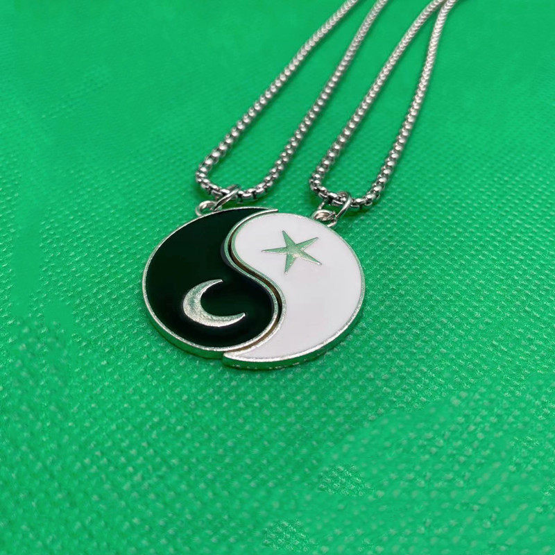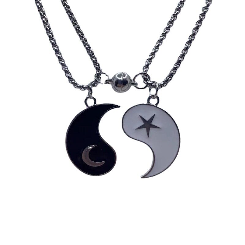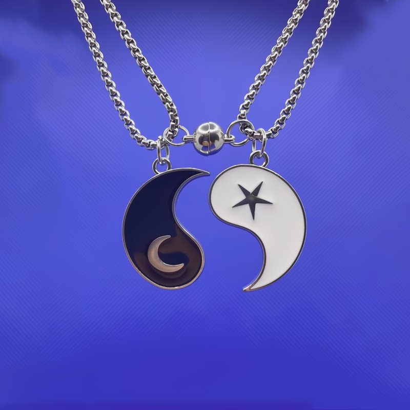 二つで一つになる陰陽モチーフのペア アクセサリーです。 片方には三日月と小さな月、もう片方には星の紋章が施され、合わせると美しい調和を生み出します。 大切な人との絆を象徴するネックレスで、お互いを思い合う気持ちを形にしました。 マグネット式の留め具で着脱も簡単です。 恋人同士や友人同士で身に着けることで、いつも繋がりを感じられる特別なアイテムです。