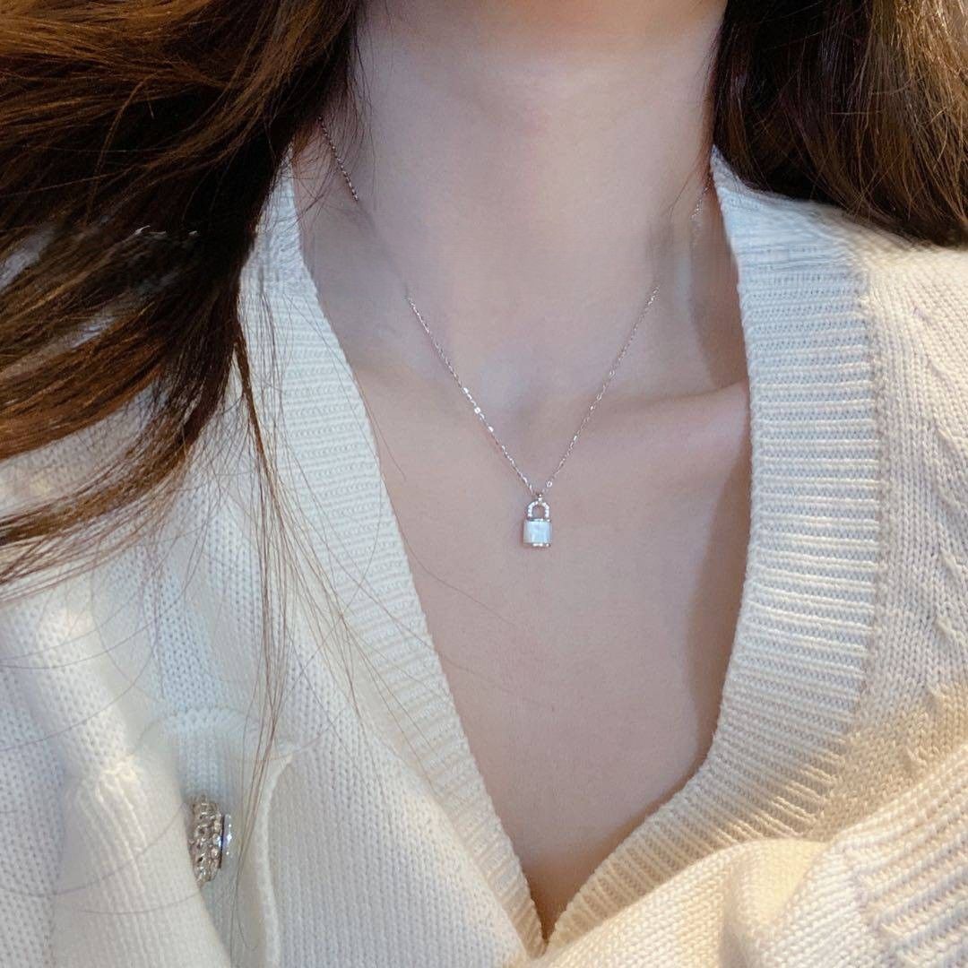 滑らかな光沢を放つ南京錠型のペンダントトップには、繊細な輝きを添える装飾が施されています。