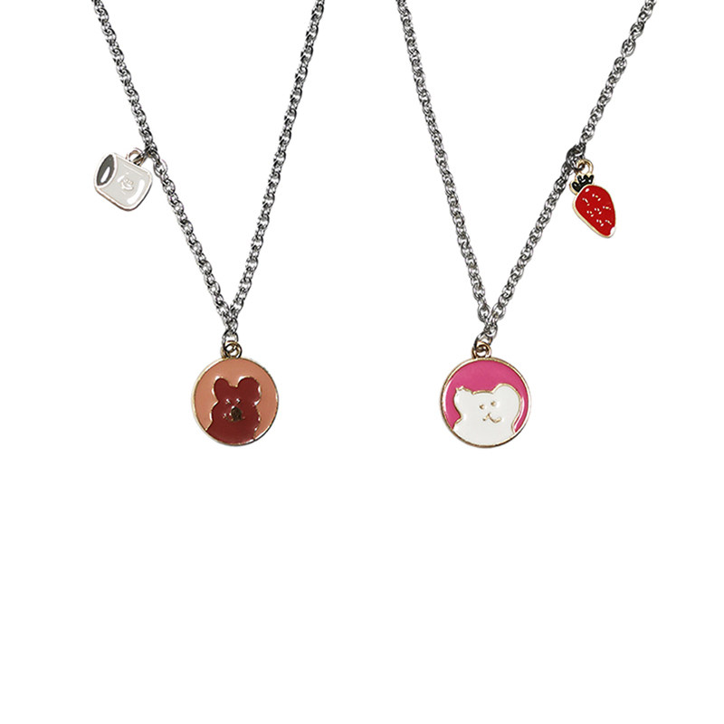 愛らしいくまのキャラクターをデザインしたペア アクセサリーのネックレスです。 丸型のチャームに描かれた表情豊かなくまと、いちごやミルクのワンポイントモチーフが遊び心を演出します。 チェーンには小さないちごやミルク缶のチャームが添えられ、さりげない可愛らしさをプラス。 二人でお揃いで身につけることで、特別な絆を感じられるデザインです。 日常使いしやすいシンプルなチェーンで、カジュアルなコーディネートにも馴染みます。
